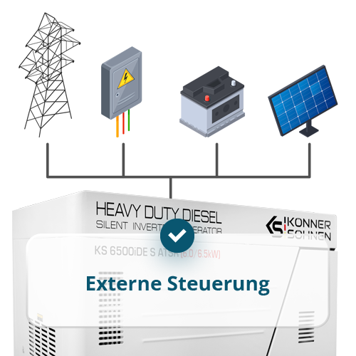 • Externe Steuerung – für den Anschluss externer Steuergeräte, ermöglicht Start/Stopp des Generators und Integration in automatische Systeme über potentialfreie Kontakte, wie Solarinverter, USV-Systeme und andere.