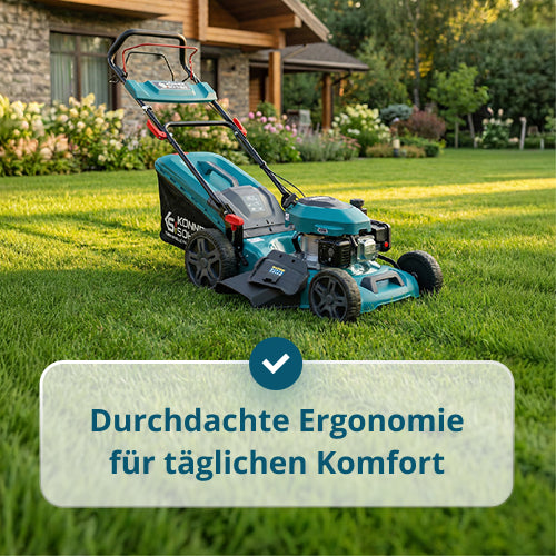 • Minimaler Kraftaufwand selbst auf großen und anspruchsvollen Flächen. Der Radantrieb des Rasenmähers sorgt für eine gleichmäßige Vorwärtsbewegung ohne manuelles Schieben, reduziert die Belastung von Armen und Rücken erheblich und erleichtert das Mähen bei längeren Arbeiten auf großen Flächen und an Hängen.