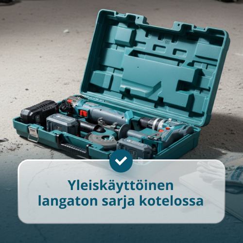 • Universal cordless kit in a case – two tools in one set: an impact drill and an angle grinder with 2 batteries and a charger for various household tasks.