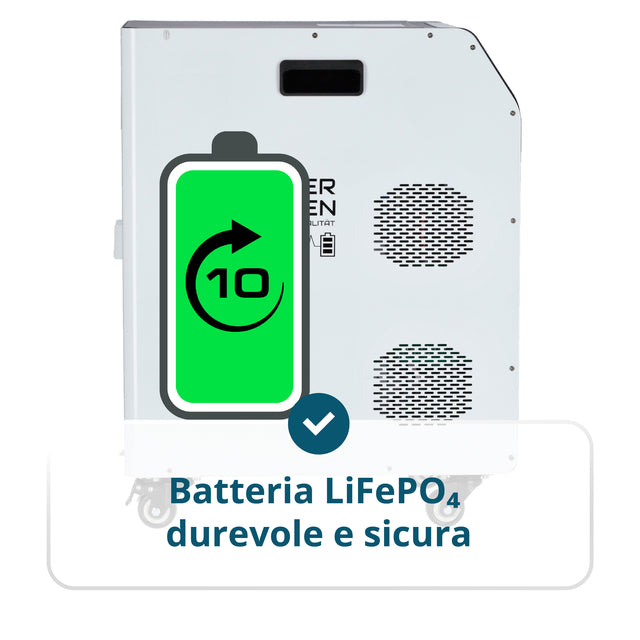 Uscita 48V DC per generatore o batteria, Inverter con onda sinusoidale pura, LiFePO₄ 5,12 kWh, Controller MPPT, UPS < 10 ms, Supporto Tandem Power, Ricarica rapida fino all’80% in 1 ora, Protezione da sovraccarico e surriscaldamento, Display LCD con monitoraggio dei parametri, Ruote e maniglie per il trasporto |